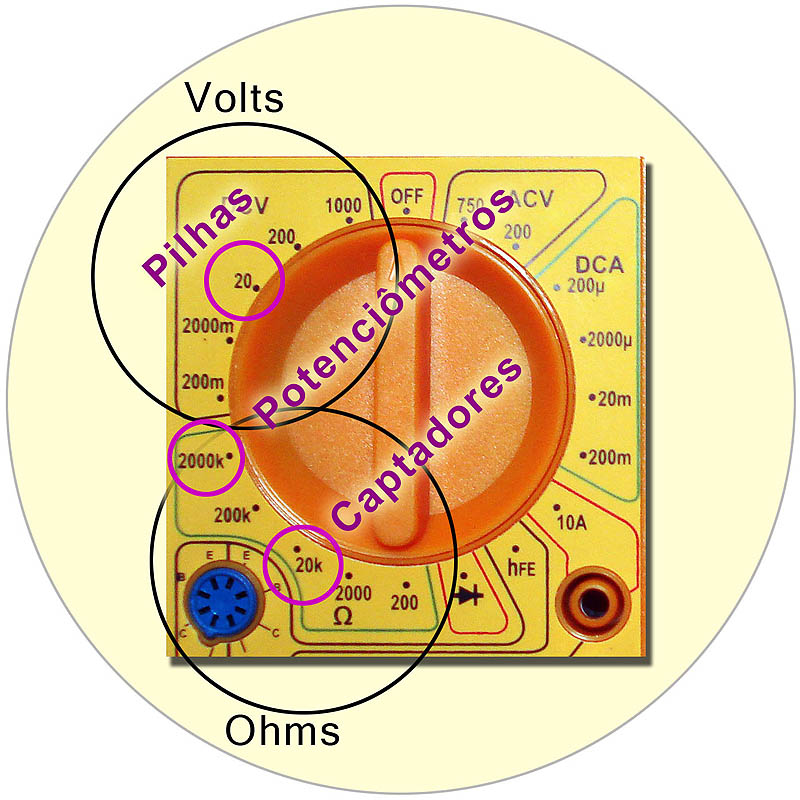 A resistência é medida em ohms. 1000 ohms: 1 Kohm. Coloque o seletor na posição da foto e faça o contato das agulhas ("sondas" preta e vermelha) com os dois fios dos captadores. A ordem não é importante. Qualquer agulha em qualquer fio. A resistência dos captadores pode ser medida nos terminais dos fios de cobre, nos fios de ligação do captador ou, se o captador já estiver instalado, através do jack do cabo (qto mais curto o cabo, melhor). Veja: